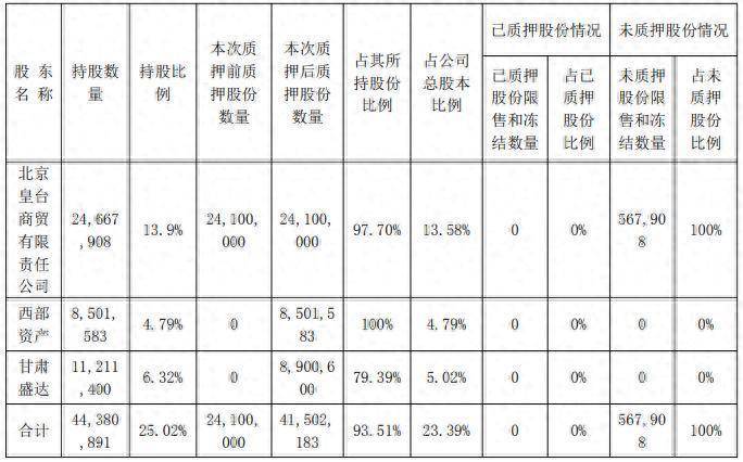 截至公告披露日,皇台酒业控股股东及一致行动人累计质押股份占其所持股份的93.51%,占公司总股本的23.39%。