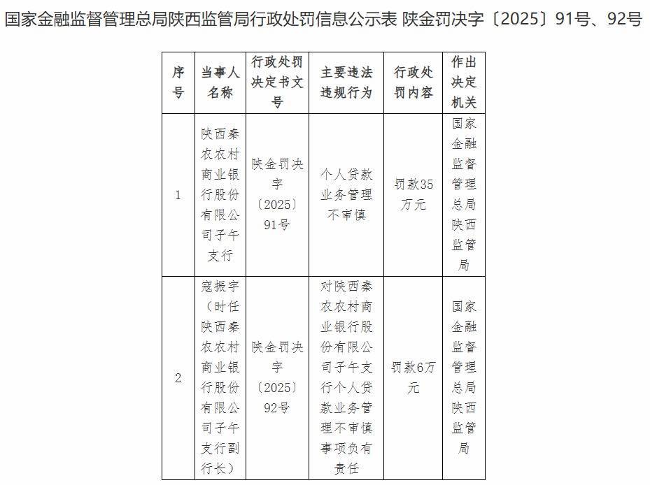 【大河财立方消息】12月12日,国家金融监督管理总局陕西监管局披露的行政处罚信息公示表显示,陕西秦农农村商业银行股份有限公司子午支行因个人贷款业务管理不审慎,被罚35万元。
